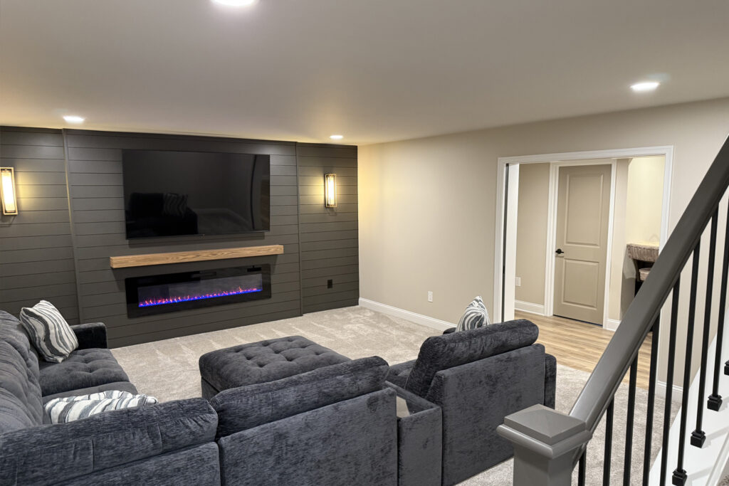 Many homeowners are adding shiplap or trimmed accent walls, electric fireplaces, built-in shelving, or soundproofing for media rooms — each adding unique character and value to the basement.